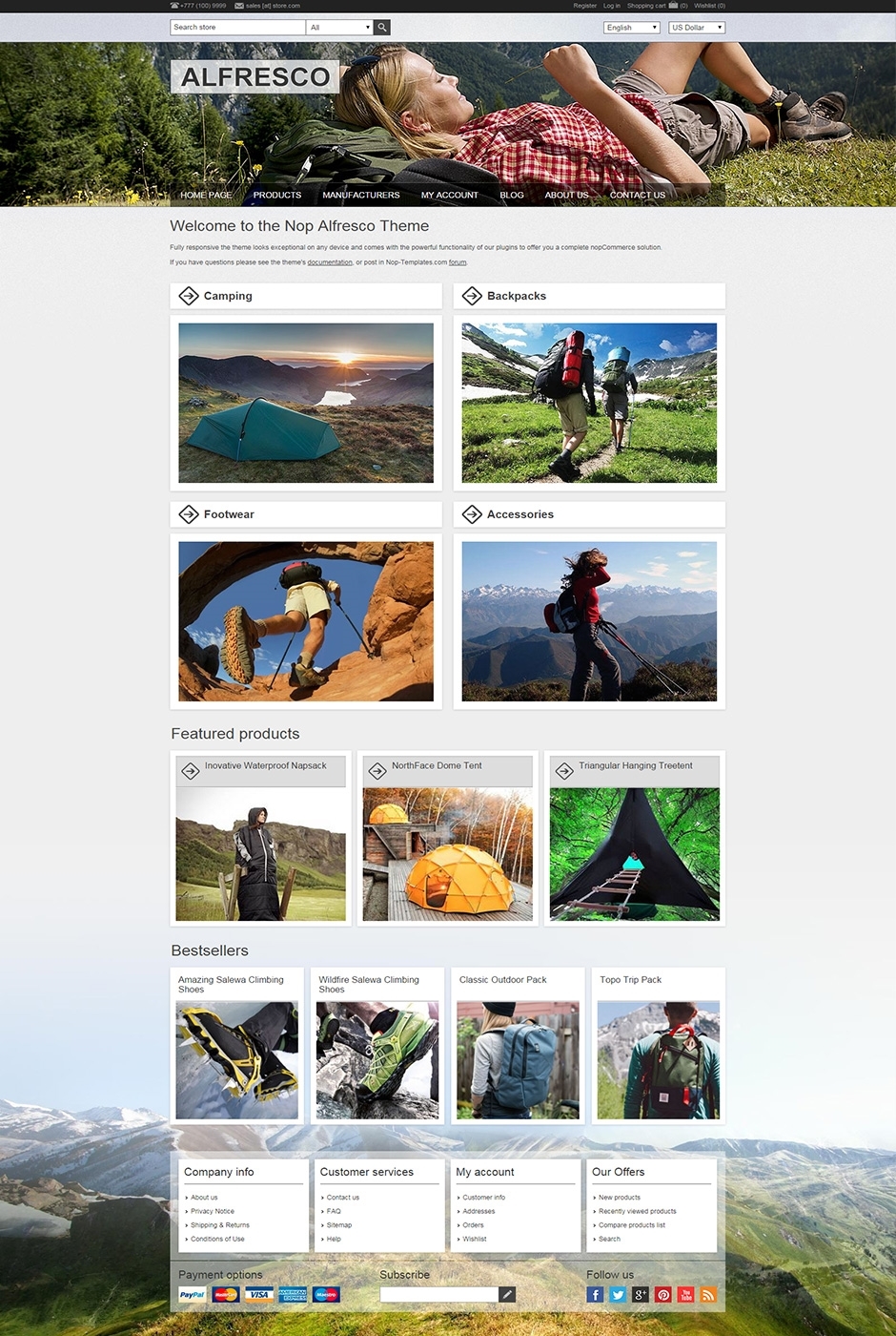 Give your online store a fresh, sleek and trendy look with the Nop Alfresco Theme. Fully responsible, the theme looks exceptional on any device and comes with 10 powerful nopCommerce plugins. The theme is ideal for outdoors, sports, apparel, or active footwear stores.