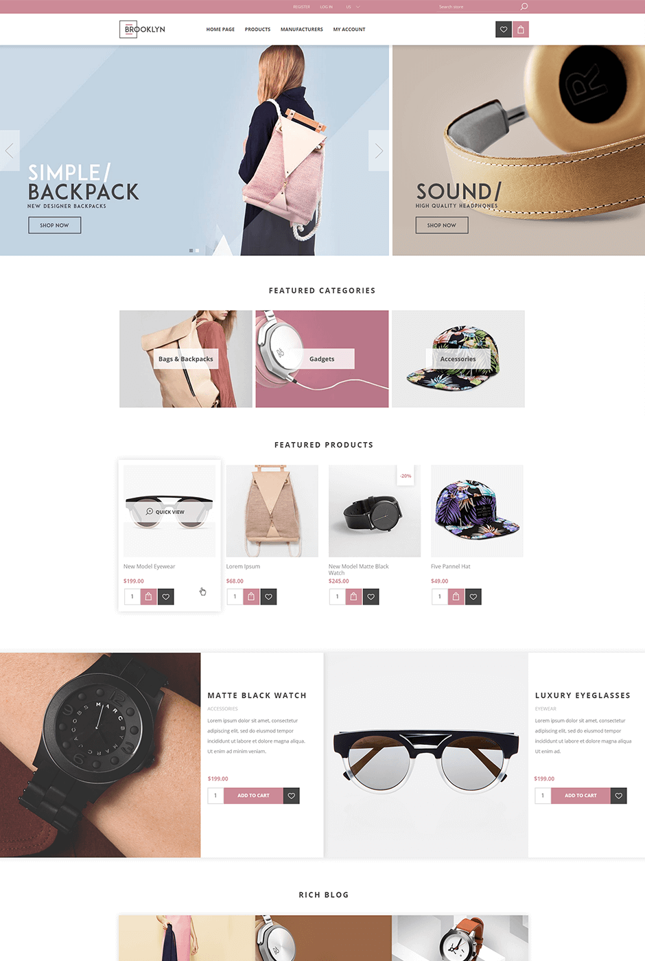 The Nop Rich Blog Plugin comes with the theme and will help you manage your blog content better. Now you can feature selected blog posts on your home page, have a blog search to help your readers quickly find the article they are looking for, organize your blog content into categories, and much more.