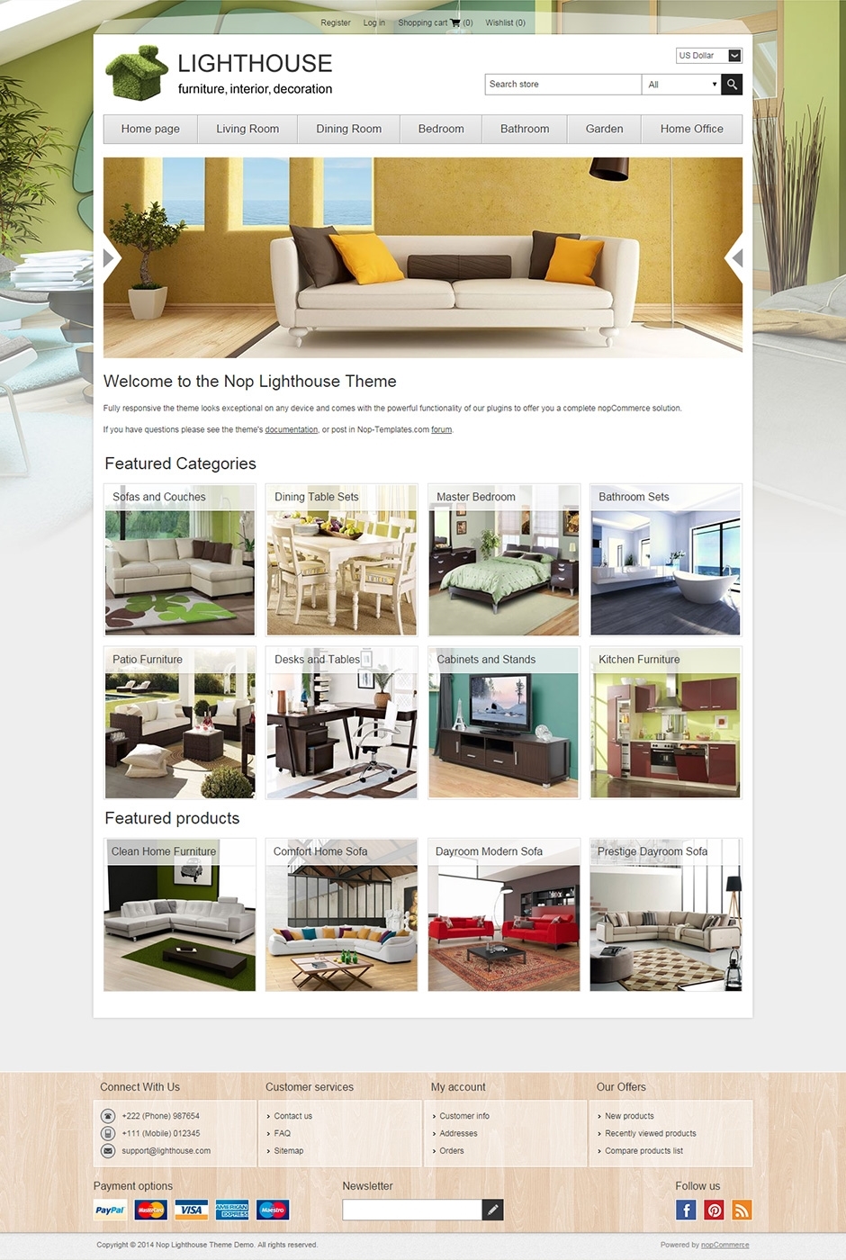 The Nop Lighthouse Theme is suitable for furniture, interior and home&garden stores. Its smooth and modern design goes hand in hand with great nopCommerce functionality to offer the ultimate tool for your Ecommerce business. This fully responsive theme will definitely give your online store a modern and professional look.