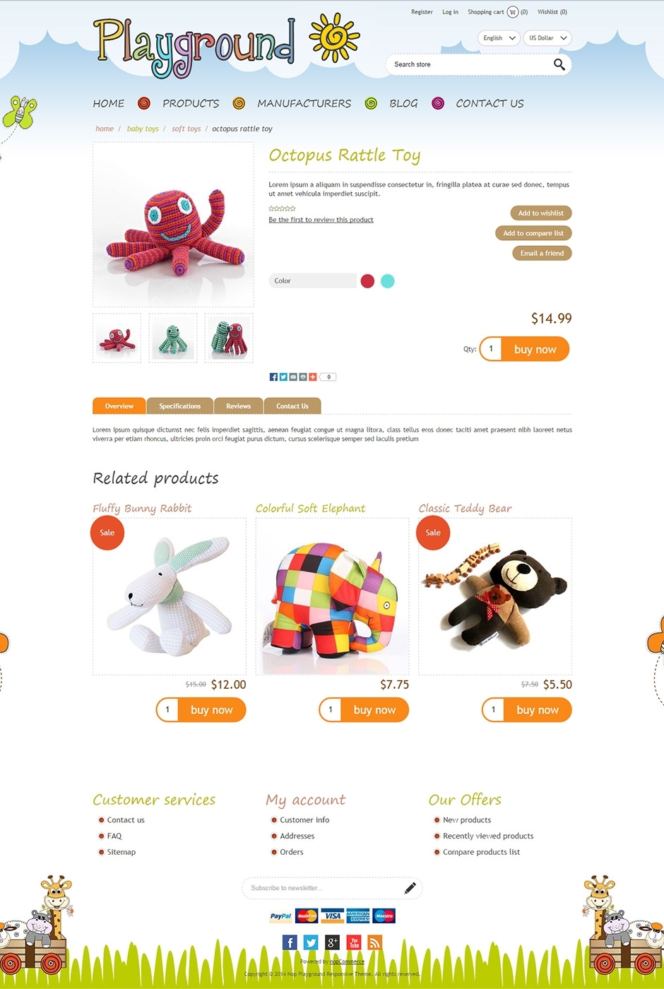 THE SUPPORT AND UPGRADES FOR THIS THEME HAVE BEEN DISCONTINUED. The Nop Playground Theme will enchant with its lovely design and first-rate eCommerce functionality. The theme is perfect for selling baby& kids toys, clothes and accessories. It has beautiful responsive design features and offers a variety of customization options for setting up your dream online store.