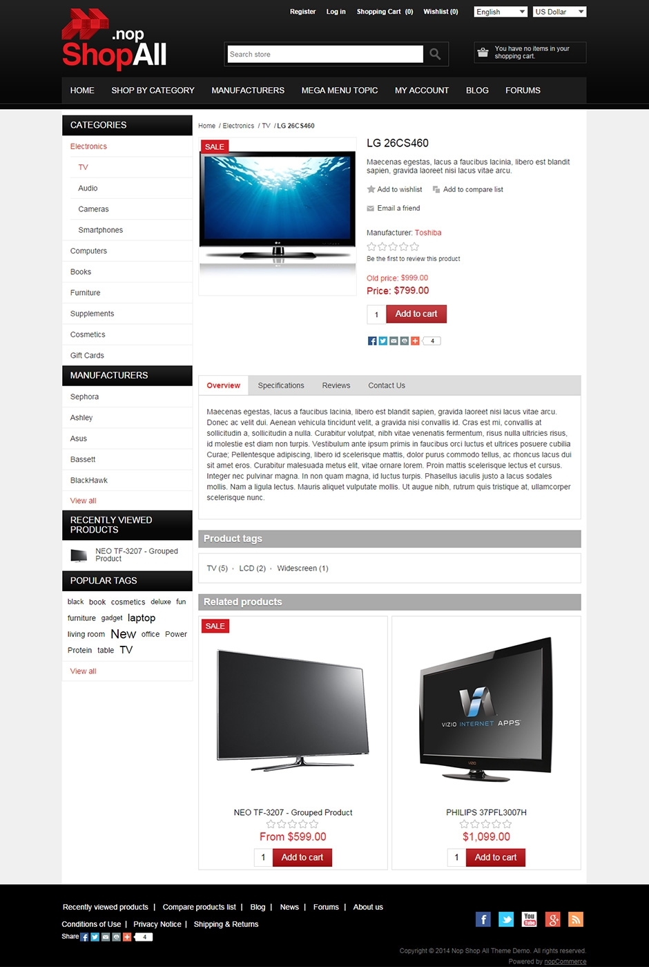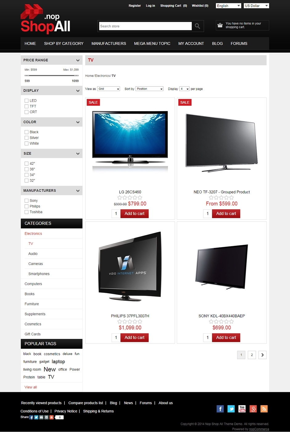 THE SUPPORT AND UPGRADES FOR THIS THEME HAVE BEEN DISCONTINUED. The Nop ShopAll Theme for nopCommerce has much to offer – a compelling look, easy to use navigation and functionality that makes shopping a breeze. This truly responsive theme looks exceptional on every mobile device and is perfect for selling electronics, furniture and hardware.