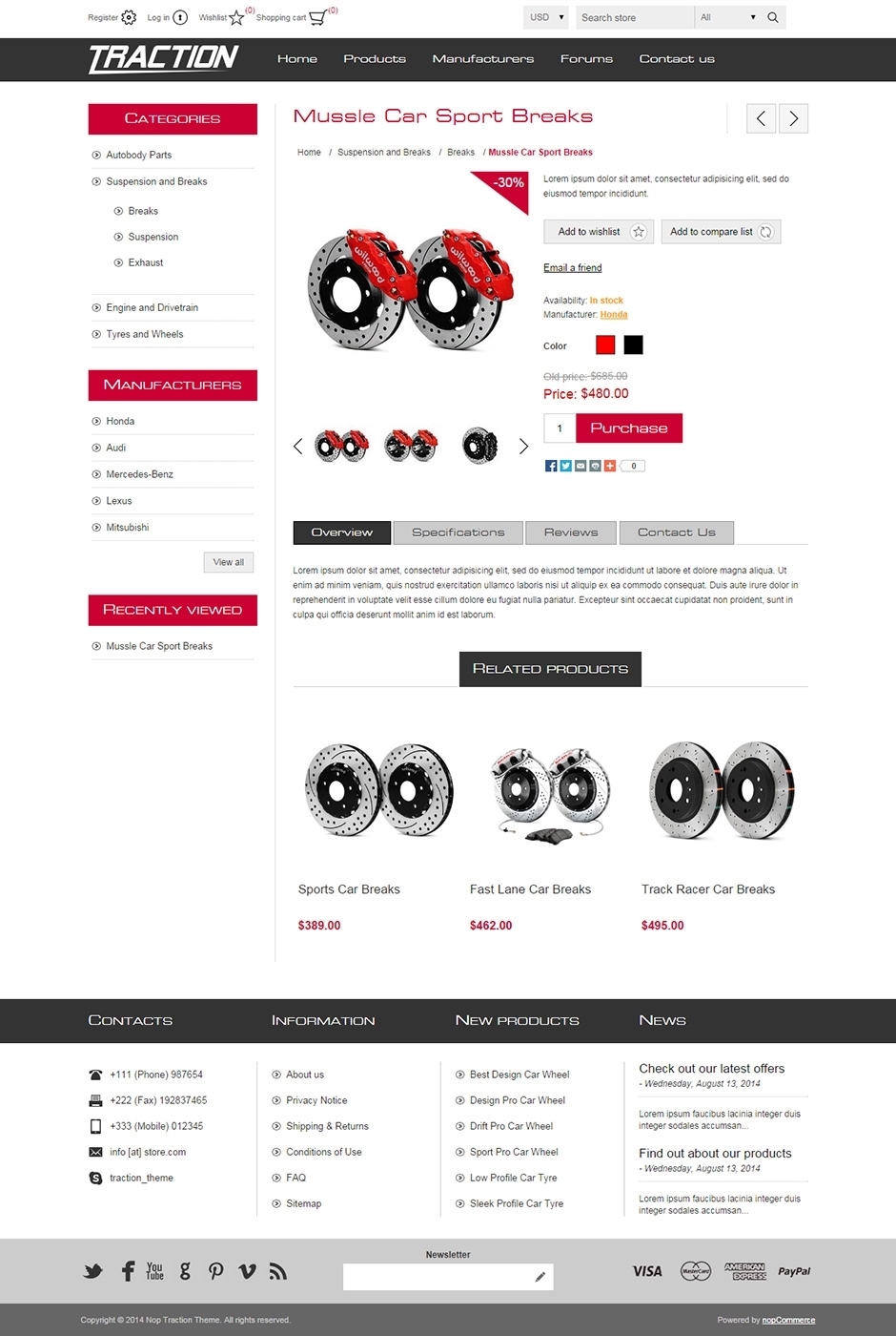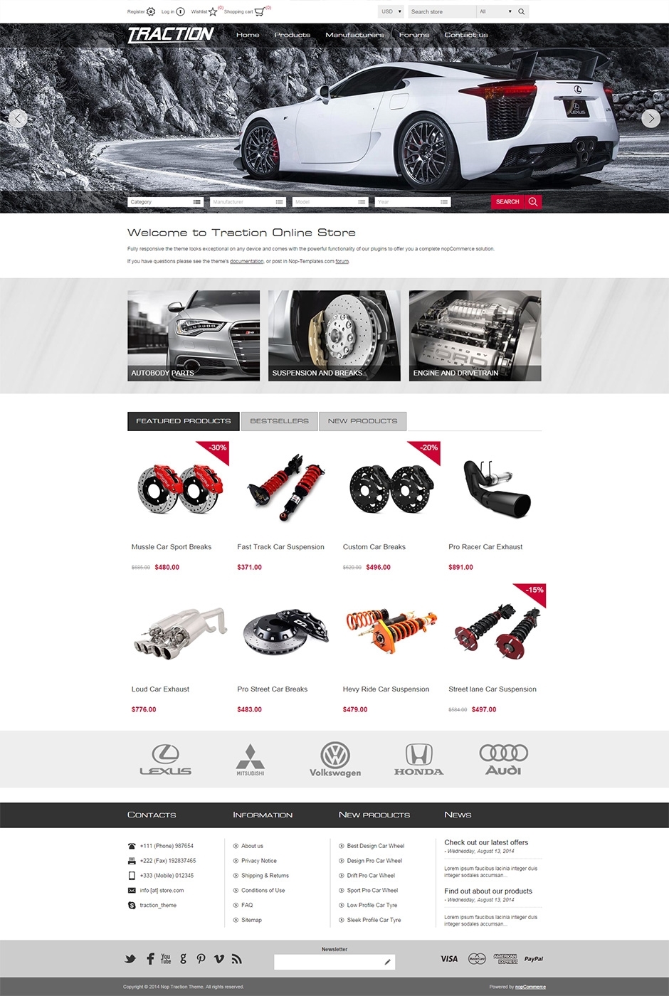 Nop Traction Theme for nopCommerce offers everything you need for setting up a top-class ecommerce store. Its secret lies in the combination of clean, stylish design and powerful functionality delivered by 10 nopCommerce plugins. The theme is the first in our portfolio to have a home page filters which offer a preliminary search capability. It is suitable for auto parts, car dealer, gadgets, and electronics stores.